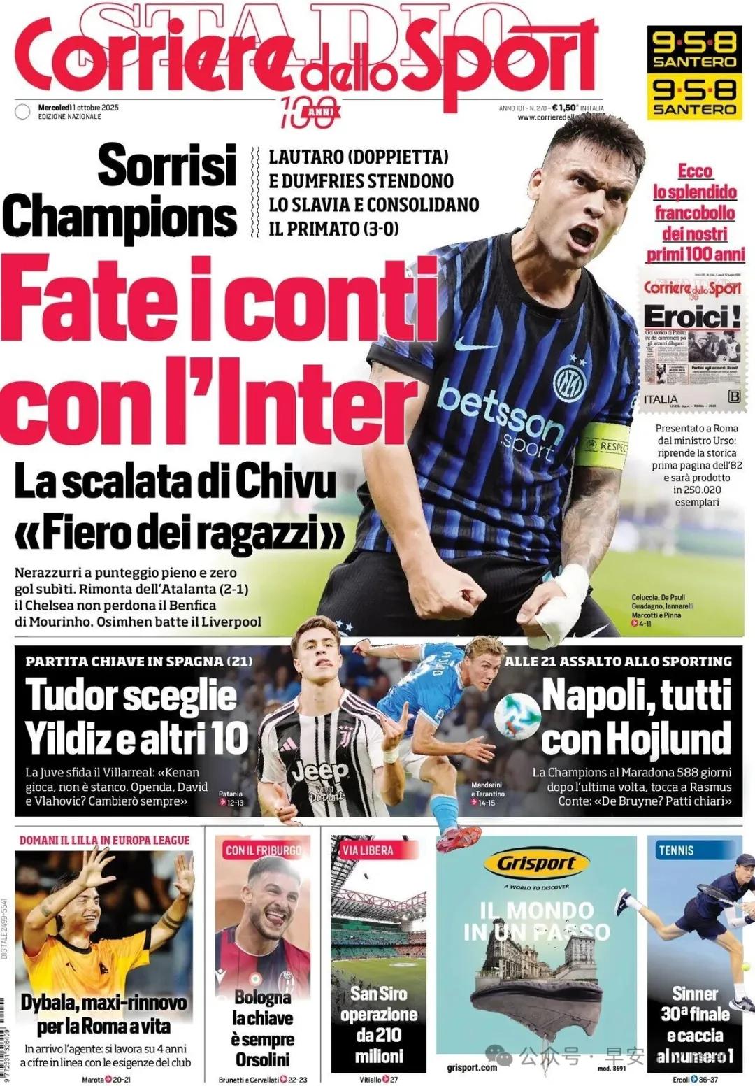1. Inter Milan có thể xử lý nụ cười Champions League. Lautaro (cú đánh đôi) và Dumfries đánh bại Slavia, củng cố vị trí hàng đầu. Cơn leo của Zivo: "Hãy tự hào về các chàng trai." Nerazzurri ghi bàn hoàn hảo mà không để thủng lưới bóng. Atlanta đảo ngược 2-1 và Chelsea cho thấy không có lòng thương xót đối với Benfica của Mourinho. Osmaine đánh bại Liverpool.